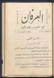 The Arabic Shiite reform journal al-Irfan (Arabic: العرفان; DMG: al-ʿIrfān; English: "Knowledge") was founded in Beirut by Aḥmad ʿĀrif az-Zain (1884-1960) in 1909. From 1910 the publication was transferred to a special printing house in Saida, South Lebanon. Az-Zain, who had worked before for different magazines, among others Ṯamarāt al-funūn (1875-1908), was in charge until 1960. Together with Aḥmad Riḍā (1872-1953) and Sulaimān Ẓāhir (1873-1960) he initiated a new stage of Nahḍa with this encyclopedic educational journal in South Lebanon.[1][2]