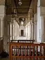 Ez-Zituna mosque followed the design and architecture of previous mosques, mainly the Mosque of Uqba, and was an inspiration for later mosques such as the Great Mosque of Cordoba. The courtyard is accessible via nine lateral doorways and forms a rectangle surrounded by galleries supported by columns made variously of marble, granite or porphyry and which were taken from ancient monuments (primarily from Carthage), as were those in the prayer hall.[2] The square minaret rises from the northwest corner of the courtyard. Built in 1894, the minaret is 43 meters (141 ft) high[11] and imitates the decoration of the Almohad minaret of the Kasbah Mosque with its limestone strap-work on a background of ochre sandstone.[2] Presidents Bourguiba and Ben Ali carried out major restoration work and rehabilitation, especially during the 1960s and 1990s.[12] The dome was added by the Zirids around 991. A beautiful structure about 12 metres in height and 4 metres in width, the dome is considered to be one of the most beautiful domes in Tunis. It fuses Fatimid structural and decorative elements from North Africa as well as Cairo, and has designs similar to the Al Anwar Mosque in cairo. During this time, a courtyard containing arches of the Magrebi horseshoe style was added along with Byzantine style columns thought to be imported from older structures