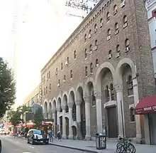 Above the arcade are additional stories with round-arched openings, each containing a one-over-one sash window.[23] The facade of the auditorium, to the east, has two stories above the arcade.[11] The stage house to the west has three stories.[23] There is a corbel table with Romanesque-style round arches near the top of the facade; additional stories rise above the main roof. The upper stories of the stage house are set back from the main roof. In front of this is a large metal sign board facing east toward Eighth Avenue, which is used to display the name of the present production.[24]