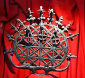 Many of the artefacts discovered at Alacahöyük, including magnificent Hattian gold and bronze objects found in the Royal Tombs, are housed today in the Museum of Anatolian Civilizations in Ankara. Among these artefacts are gold and electrum standing cups and other vessels. The most unusual are the Alaca Höyük bronze standards; bulls or stags on pedestals whose purpose remains the subject of debate. The standards are cast in copper, many in the form of flat circles, half-circles or squares that are filled with an openwork network of cross bars, central crosses, and swastikas. Leonard Woolley[5] found that the Royal Tombs "seem to belong to the end of a period, as marked by a stratum of destruction and the burning of the citadel. The culture which the tomb objects illustrate does not continue into the next historical phase, that of Kültepe". Modern assessment[6] finds that the site continued as a flourishing community to the end of the Late Bronze Age. There was also a sizable occupation in Phrygian times.