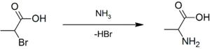 Racemic alanine can be prepared by the condensation of acetaldehyde with ammonium chloride in the presence of sodium cyanide by the Strecker reaction,[15] or by the ammonolysis of 2-bromopropanoic acid.[16]