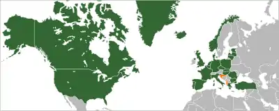 The accession of Albania to NATO took place in 2009. Albania's relationship with the North Atlantic Treaty Organization (NATO) began in 1992 when it joined the North Atlantic Cooperation Council.[1] In 1994, it entered NATO's Partnership for Peace, which began Albania's process of accession into the alliance.[2] In 1999, the country received a Membership Action Plan (MAP).[3] The country received an invitation to join at the 2008 Bucharest Summit and became a full member on April 1, 2009.
