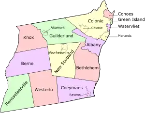 The Manor of Rensselaerswyck was created as a district within the county in 1772, and later divided into two districts, one on each side of the Hudson River in 1779. The west district included all of what is now Albany County other than lands were in the city of Albany at the time.[9] Though the Manor of Rensselaerswyck was the only district (along with the city of Albany) in what is today Albany County, it was not the only district in what was Albany County at the time. Pittstown in 1761, and Duanesburgh in 1764, were created as townships. But when districts were created in 1772, those townships were incorporated into new districts, Pittstown in Schaghticoke and Duanesburgh into the United Districts of Duanesburgh and Schoharie.[7] Schenectady was also made from a borough to a district in 1772.[10] Other districts established in 1772 were Hoosick, Coxsackie, Cambridge, Saratoga, Halfmoon, Kinderhook, Kings, Claverack, Great Imboght, and the Manor of Livingston.