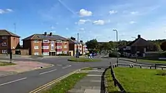 During the 1930s, New Ideal Homesteads were the largest commercial developer active in north west Kent, known for keeping costs at a minimum by using prefabricated materials.[2] They built the Albany Park estate in the middle of that decade, on land that had formerly been the Tanyard and Hurst Farms, part of the estate of the Vansittart family who lived at nearby Foots Cray.[1] Most of the area had consisted of fields and spinneys, although nearby there was both an eighteenth-century mansion known as Hurst or Hurst Place, and Sidcup cemetery, which had been established in 1912.[1]