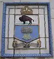 The dam of Albert Memorial Bridge with a terracotta representation of the Saskatchewan coat of arms above