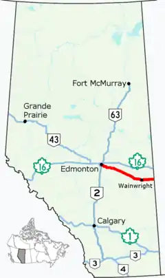 Alberta Provincial Highway No. 14, commonly referred to as Highway 14, is an east-west highway in central Alberta, Canada. It stretches from Edmonton through Wainwright to the Alberta–Saskatchewan border, running parallel to the more northern Highway 16.[2] Highway 14 is about 257 kilometres (160 mi) long.