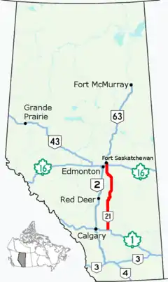 Alberta Provincial Highway No. 21, commonly referred to as Highway 21, is a north-south highway in Alberta, Canada that parallels Highway 2 between Calgary and Edmonton.[1] It is approximately 328 kilometres (204 mi) in length.[2] It begins at the Trans-Canada Highway (Highway 1) east of Strathmore, and ends at Fort Saskatchewan where it is succeeded by Highway 15.[3] The northernmost 25 kilometres (16 mi) of the highway are twinned. Highway 21 runs roughly parallel to the main north-south CN rail line between Calgary and Edmonton between Three Hills and Looma.
