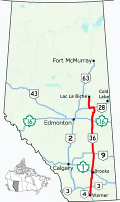 Alberta Provincial Highway No. 36, commonly referred to as Highway 36 and officially named Veterans Memorial Highway,[2] is a north-south highway in eastern Alberta, Canada that extends from Highway 4 near Warner to Highway 55 in Lac La Biche.[1] Lac La Biche County is lobbying the Government of Alberta to renumber Highway 881 to Highway 36 from Lac La Biche north to Highway 63 south of Fort McMurray.[3][4]