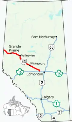 Alberta Provincial Highway No. 43, commonly referred to as Highway 43, is a major highway in northern and central Alberta, Canada that connects Edmonton to the British Columbia border via the Peace Country, forming the northernmost portion of the CANAMEX Corridor in Alberta. It stretches approximately 495 km (308 mi) from Highway 16 (Yellowhead Highway) near Manly Corner west of Edmonton to the British Columbia border west of Demmitt.[2][3] It is designated as a core route in Canada's National Highway System, comprising a portion of a key international corridor that stretches from Alaska into Mexico.