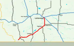 Highway 5 begins in the Hamlet of Waterton Park within Waterton Lakes National Park. After leaving the park, the highway generally travels east, passing by the hamlets of Mountain View and Leavitt, to the Town of Cardston.[1] After Cardston, the highway generally travels northeast, passing by the Hamlet of Spring Coulee, the Town of Magrath, and the Hamlet of Welling Station. Shortly after Welling Station, the highway travels north, passing the Hamlet of Welling, before ending at Highway 3 in Lethbridge.[2][3]