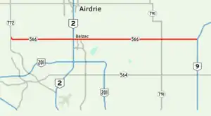 Alberta Provincial Highway No. 566 in the Canadian province of Alberta lies approximately halfway between Calgary and Airdrie, running west to east from Highway 772 (Symons Valley Road) to Highway 9 near the hamlets of Kathyrn and Keoma.[2]