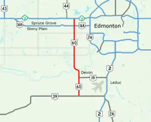 Alberta Provincial Highway No. 60, commonly referred to as Highway 60 and officially named Devonian Way, is a north–south highway west of Edmonton in the Canadian province of Alberta, connecting Highway 39 to Highway 16. In tandem with Highway 19, it is often used as a southwest bypass of Edmonton for travellers wishing to avoid traffic within the city.[1][2]