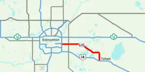 Wye Road is a major arterial road and rural highway that links Sherwood Park from Anthony Henday Drive (Highway 216) on the east side of Edmonton to Highway 14 west of Tofield.[1] It is preceded by Sherwood Park Freeway, and east of Highway 21 is designated as Alberta Provincial Highway No. 630, commonly referred to as Highway 630.[2] Wye Road is part of a 40-kilometre-long (25 mi) continuous roadway that runs through Sherwood Park, Edmonton, and St. Albert that includes Sherwood Park Freeway, Whyte Avenue, portions of University Avenue and Saskatchewan Drive, Groat Road, and St. Albert Trail.