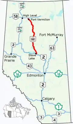 Highway 88 begins at its intersection with Highway 2 at the Town of Slave Lake, passing through Red Earth Creek and Fort Vermilion and ending at Highway 58 approximately 57 km (35 mi) east of the Town of High Level. It crosses the Peace River approximately 13 km (8.1 mi) south of Highway 58. The total length of the highway is 428 km (266 mi).[1][3]