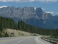 Highway 93 connects with the Trans-Canada Highway (Highway 1) at Castle Junction, midway between Banff and Lake Louise.[3] Highway 93 follows the Trans-Canada Highway for 28 km (17 mi) northwest, diverging from highway 1 west of Lake Louise. Highway 1 continues west to Yoho National Park. The Bow Valley Parkway (Highway 1A) also links Lake Louise and Banff. This road parallels Highway 1 and, at the midpoint, passes Castle junction where it links with Highway 93.[3]