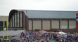 The Broncos moved to the Big West and Division I-A in 1996, which resulted in another stadium expansion. The two-tier grandstands were extended around the corners of the south end zone, raising the permanent seating capacity to 30,000 in 1997.[3] The latest stadium expansion was completed in time for the 2008 season, with the addition of the Stueckle Sky Club press box, luxury suites, loge boxes, and club seating; raising the capacity to 32,000. In the summer of 2009, 1,500 additional bleacher seats were added to the south end zone to bring capacity up to 33,500.[15] Prior to the 2012 season, expanded bleacher sections were added to the north and south end zones, expanding capacity to a total of 36,387.[16]