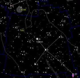 Since Cygnus is the swan, and Beta Cygni is located at the head of the swan, it is sometimes called the "beak star".[29] With Deneb, Gamma Cygni (Sadr), Delta Cygni, and Epsilon Cygni (Gienah), it forms the asterism called the Northern Cross.[30]