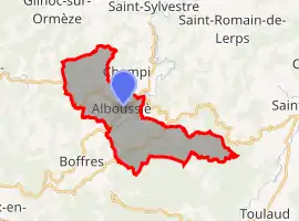 Alboussière is located some 10 km west of Valence and 10 km east of Lamastre. It can be accessed by the winding D533 road from Valence which passes through the village and continues west to Saint-Barthélemy-Grozon. The D14 road from Vernoux-en-Vivarais in the south also passes through the commune to join the D533 just north of the commune. The commune is also covered with a network of small roads. There are nine other hamlets in the commune other than the village. These are: Aubert, Blanc, Les Chatanelles, La Chalaye, Bleizac, Le Mas, Le Vivier, Ponsoye, and Fialaix.[4]