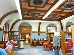 The library’s interior includes intricate oak wood, or similar woods stained to match. The first floor contains three fireplaces made of Italian marble. These seem to be used even though the library was built to be compatible with steam heat and electricity. The first floor contains mosaic Italian marble floors. A notable feature of the second floor are Mycenaean marble pillars that existed surrounding the original overlook into the circulation department. The original railing for this overlook was made of intricate wood designs.[18] During the winter of 1954 through 1955, renovations to the library closed the floor of the reference department.[19] Today, sections of the original railing are displayed on a wall in the Reference Section as decoration.