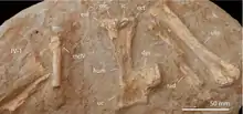| A, humerus of holotype; B, radius and ulna of holotype; C, sternum of holotype; D, referred metacarpal IV; E, metacarpal IV and scapulocoracoid of holotype; F, femur of holotype. | |