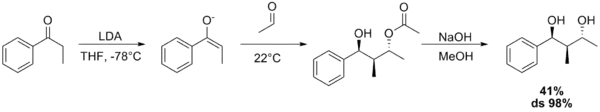 The Aldol–Tishchenko reaction is a tandem reaction involving an aldol reaction and a Tishchenko reaction. In organic synthesis it is a method to convert aldehydes and ketones into 1,3-hydroxyl compounds. The reaction sequence in many examples starts from conversion of a ketone into an enolate by action of lithium diisopropylamide (LDA), to which a suitable aldehyde is added. The resulting mono-ester diol is then converted into the diol by a hydrolysis step. With both the acetyl trimethylsilane[1] and propiophenone[2] as reactants, the diol is obtained as a pure diastereoisomer.