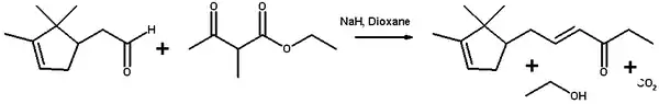 Ethyl 2-methylacetoacetate and campholenic aldehyde react in an Aldol condensation.[14] The synthetic procedure[15] is typical for this type of reaction. In the process, in addition to water, an equivalent of ethanol and carbon dioxide are lost in decarboxylation.