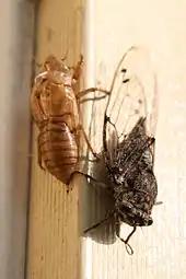 The shells shed by the nymph, as with those of other cicada species, are often collected by children and sometimes attached to their clothing.[13] Schoolchildren have been known to bring live adults into classrooms to startle the class with their "strident shrieking",[31][32] typically to the observable displeasure of teachers.[33] Children often climb trees to collect them, and keep them temporarily as pets in shoeboxes. They cannot easily be kept for longer than a day or two, given that they need flowing sap for food.[22] A poem dedicated to the floury baker appeared in the Catholic Press in 1930, describing its life cycle to children.[34]
