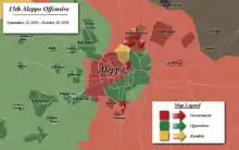 Early on 24 September, military preparations were being made for the Syrian Army to assault the southern Sheikh Sa'id district.[54] The attack started that morning, and within hours government troops had taken control of several building blocks.[55][56][57] Concurrently, pro-government militias continued to advance in the Handarat Camp area,[58] seizing the eastern entrance to the Camp and leaving only half of it still rebel-held.[51] Shortly after, the Palestinian militias captured the whole Handarat Camp.[59][60][61] In addition, government troops made advances on a third axis, taking control of two dozen building blocks near the historic Aleppo citadel in the city center.[55] Meanwhile, a new wave of air-strikes were conducted throughout Aleppo, and a military official stated the strikes had been targeting an array of rebel fortifications, including tunnels, bunkers and command centers.[62] Following the capture of the Handarat Camp district, the Army shifted its focus to the nearby Kindi Cancer Hospital, which had been converted into a military base by the rebels.[63] Intense clashes took place at the hospital, as the Army also imposed fire control over the nearby Shuqeif Industrial Area.[64] Later that evening, an initial rebel counter-attack against the Handarat Camp was repelled.[65] However, pro-government militias withdrew from the district, while still maintaining control of the nearby Shaher sector and the Handarat Industrial District, east of the refugee camp.[66][67]