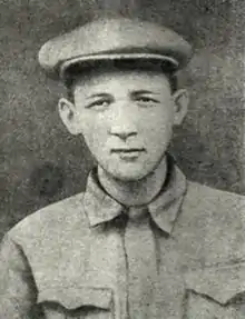 Sixteen-year-old Shura Chekalin engaged in underground resistance activities in the region of Tula near Moscow. In the first days of November 1941, he took part in an ambush of German vehicles, destroying one vehicle with a hand-grenade. After becoming ill, Chekalin was bedridden, and his location was betrayed to the Germans by an unknown informant.[1] When Germans approached to arrest him, he threw a hand grenade at them, but it failed to explode. He was brutally tortured, and hanged on 6 November 1941.[2] His body was left hanging for twenty days, taken down only after the area had been retaken by the Red Army.