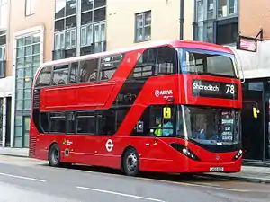 In late 2015, Alexander Dennis launched the Enviro400 City, a premium model of the Enviro400 MMC, featuring restyled front and rear ends to match the single-decker Enviro200 MMC and a glass staircase as standard amongst other features, designed to compete with the New Routemaster and Wright SRM designs in the London bus market.[60][61][62] The first production examples, built with hybrid powertrains, entered service with Arriva London on route 78; a repeat order in 2016 would later see this fleet grow to a total of 53 Enviro400 Cities.[63]