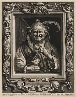 Alexander Voet was a reproductive artist who made prints after the works of contemporary Antwerp masters such as Rubens, Jacob Jordaens and others. An example is the Old fool with his cat, which he made and published after a design by Jordaens. The composition recalls a painting of The woman, the fool and his cat of the mid 1640s by Jordaens (private collection) and also uses a decorative frame border reminiscent of Jordaens' tapestry designs.[2]