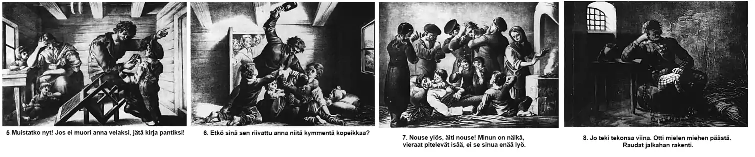 In 1858, on Ekman's recommendation, she was asked to provide drawings for a publication of the Raittiuden Seuran (temperance society); an anti-alcohol booklet called Turmiolan Tommin Elämäkerta (The Life Story of Pernicious Tommy). Her drawings were engraved by F.O. Liewendahl (fl.1850s-1860s) and the booklet was reissued for many years.[2] The story itself (by an unknown writer) came to be referenced in several popular songs; as recently as 1982 by the Finnish rock band Eppu Normaali.