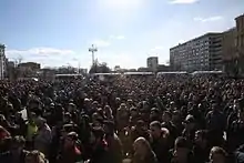 Alexei Navalny announced his intention to run for President of Russia on 13 December 2016 and since then has been traveling to cities throughout Russia to meet with supporters and open regional offices.[8] He had first spoken about doing so in April 2013, and in September of that year, he had taken part in the Moscow mayoral election, in which he got 27% of the vote.[9][10] Before that, he was one of the main leaders of the 2011 protests after the parliamentary election.[11] As noted by Newsweek and the former Russian presidential administration adviser Gleb Pavlovsky,[12] the campaign by Navalny is unprecedented in modern Russia as most candidates do not start campaigning until a few months before the election.[3] His chief of staff Leonid Volkov stated that part of the reason they started a year early was to raise support and to give the Russian government no choice but to let Navalny take part in the election in spite of ruling regarding the Kirovles case.[13] The primary focus of Navalny's campaign is combating the corruption within the current government under Vladimir Putin and Prime Minister Dmitry Medvedev.[3] In mid-April 2017, Navalny was endorsed by the exiled oligarch Mikhail Khodorkovsky[14] and the liberal People's Freedom Party leader Mikhail Kasyanov as an alternative to incumbent President Vladimir Putin.