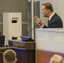 Concerns about Navalny's participation in the elections include the "Kirovles case", when in 2009, according to investigators, Navalny ordered a local businessman to create an intermediary company then persuaded the administration of the local Kirov Oblast corporation Kirovles to sign a deal with the new company on unfavorable terms. Kirovles allegedly lost millions of dollars while the middleman company made a profit. The investigation lasted until 2013 at which point he was given a five-year prison sentence, which was suspended with a 500,000 ruble fine. In November 2016 the Russian Supreme Court annulled the sentence and returned the case to the Leninsky District court in the city of Kirov for a retrial.[15] In February 2017, the district court ruled to uphold Navalny's sentence despite pressure from the European Court of Human Rights, which sided with Navalny.[16] The issue may block Navalny from participating in the elections as Russian law does not allow criminal offenders to run for office,[17] and after the retrial both Vyacheslav Volodin, speaker of the State Duma, and Medvedev's spokesman Dmitry Peskov stated that he will probably not be allowed to run.[18]