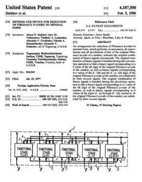 - Put forward the concept of "Fibonacci computers". The international priority of this invention was protected by the Soviet Union in an unprecedented patenting operation by Soviet standards, resulting in 65 international patents, covering the territories of U.S., Japan, U.K., France, Germany, Canada and other countries.