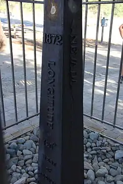 The Von Schmidt State Boundary Monument was designated a California Historic Landmark (No.859) on April 26, 1973. In 1873 San Francisco civil engineer Allexey W. Von Schmidt built the State Boundary Monument in San Bernardino County, California near Needles, California.[1] In 1872 and 1873 Von Schmidt did a survey of the border between California and Nevada/Arizona. The California Historic marker is on the dirt road, Pew Road, also called River Road, 2.6 Miles South of the State Line; 14 Miles North of Needles. The marker is not at the current state boundary, as Von Schmidt made an error in his survey. A new survey in 1893 showed that the Von Schmidt line was 1,600 to 1,800 feet off to the west. The marker is at the southern end of the California-Arizona State boundary. In 1872, a dispute arose between Nevada and California about the location of the state's boundary. Nevada wanted the state divide to be the same as the Sierra Nevada mountain range divide. California wanted the line to the east of the mountain range. When California attained statehood in 1850, it adopted 120 degrees west longitude as its eastern border.[2][3] Between 1855 and 1900 there were six surveys to locate 120 degrees, with each locating 120 degrees of longitude differently.[4] Von Schmidt applied for and was granted the contract to survey the state's frontier border east of the Sierra Nevada. In 1872 Von Schmidt using only a compass, a sextant and dead reckoning process set out with his crew to define the boundary. Von Schmidt was charged to measure and mark the boundary. Von Schmidt and his crew built stone markers and installed cast iron markers about one mile apart on the length of the state's boundary. Not many of the markers had foundations, so fewer remain today.[4] A new survey in 1893 showed that the Von Schmidt line was 1,600 to 1,800 feet west of the actual 120 degrees. However, California and Nevada both recognize the 1872 Von Schmidt survey and the 1893 survey as the state line. Later the 1893 line was used.[4] The exact location of the north-south California-Nevada border, between Lake Tahoe and the intersection of the southern boundary of Oregon at the 42nd parallel, was contentious and was surveyed and re-surveyed many time.[5] [6] [7] One of the few iron markers that has survived is a near Verdi, Nevada this is a National Historic Landmark called the 1872 California-Nevada State Boundary Marker.[8]