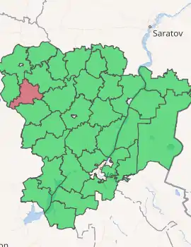 Alexeyevsky District (Russian: Алексе́евский райо́н) is an administrative[1] district (raion), one of the thirty-three in Volgograd Oblast, Russia. Municipally, it is incorporated as Alexeyevsky Municipal District.[6] It is located in the northwest of the oblast. The area of the district is 2,300 square kilometers (890 sq mi).[3] Its administrative center is the rural locality (a stanitsa) of Alexeyevskaya.[2] Population: 18,166 (2010 Census);[4] 19,189 (2002 Census);[8] 20,039 (1989 Census).[9] The population of Alexeyevskaya accounts for 23.1% of the district's population.[4]