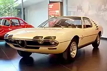 The Alfa Romeo Montreal was introduced as a concept car in 1967 at Expo 67, held in Montreal, Quebec, Canada.[3] Originally, the concept cars were displayed without any model name, but the public took to calling it The Montreal.[4] It was a 2+2 coupe using the 1.6-litre engine of the Alfa Romeo Giulia TI and the short wheelbase chassis of the Alfa Romeo Giulia Sprint GT, with a body designed by Marcello Gandini at Bertone. One of the two concept cars built for Expo 67 is displayed in the Alfa Romeo Historical Museum in Arese, Italy, while the other is in museum storage.[2]