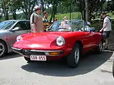 A new lower priced spider, the Spider 1300 Junior, was introduced in June 1968 alongside the GTA 1300 Junior competition coupé.[23] Its 1,290 cc twin cam engine was the same used on the GT 1300 Junior coupé, and produced 89 PS DIN (65 kW; 88 hp; or 103 PS SAE).[23][24] Top speed was 170 km/h (106 mph).[23][24] From a mechanical standpoint the Junior differed from the 1750 only in engine displacement and output, while inside it lacked some features of the pricier model: namely opening quarter lights, centre console, and the three-spoke wood rimmed steering wheel, replaced by a two-spoke plastic rimmed one. From outside the Junior version could be recognised by its black-coloured lower front bumper and absence of plastic headlamp fairings.