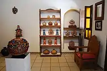 The artisan's work has been exhibited in venues in Mexico, such as the Amparo Museum and in various other countries, especially in the United States where he had exhibitions in Chicago, Dallas, New York, Washington, San Diego, Philadelphia and other cities starting in 1988, as well as Germany, Austria and Spain.[1][6] His work can be found in collections of the London Museum, the Kunsthaus in Munich and the royal family of Spain along with collections in Germany, Japan, Venezuela and Italy.[3][6] One of his most notable pieces is Homage to Mole, which is featured in the Grandes Maestros book of the Fomento Cultural Banamex. It is four feet high in Baroque style and dedicated to one of Mexico's signature dishes.[7] This piece took six months.[3]