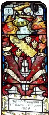 A heraldic achievement of Alfred, Lord Tennyson exists in an 1884 stained-glass window in the Hall of Trinity College, Cambridge, showing arms: Gules, a bend nebuly or thereon a chaplet vert between three leopard's faces jessant-de-lys of the second; Crest: A dexter arm in armour the hand in a gauntlet or grasping a broken tilting spear enfiled with a garland of laurel; Supporters: Two leopards rampant guardant gules semée de lys and ducally crowned or; Motto: Respiciens Prospiciens[46] ("Looking backwards (is) looking forwards"). These are a difference of the arms of Thomas Tenison (1636–1715), Archbishop of Canterbury, themselves a difference of the arms of the 13th-century Denys family of Glamorgan and Siston in Gloucestershire, themselves a difference of the arms of Thomas de Cantilupe (c. 1218–1282), Bishop of Hereford, henceforth the arms of the See of Hereford; the name "Tennyson" signifies "Denys's son", although no connection between the two families is recorded.