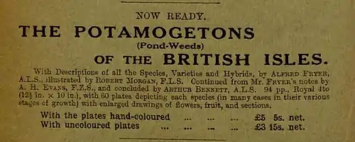 He returned to his native Fenlands in 1848 and began to devote his prodigious energy to science. At first his attention was taken up by insects, birds, shells and fossils, and it was only after 1860 that he became preoccupied with botany, corresponding with Cardale Babington, John Gilbert Baker and Arthur Bennett. His intimate knowledge of plants led to his considering a flora of Huntingdonshire, but his growing fascination with Potamogetons, or 'Pots' as he termed them, claimed priority. His circle of friends now reflected this single-mindedness - George Claridge Druce of Oxford, Charles Edward Moss of the Cambridge Botany School, Edward Walter Hunnybun (1848-1918)of Huntingdon and A. H. Evans, also corresponding with Thomas Morong (1827–1894), the American authority on the genus. During this period Fryer was growing Potamogetons in tanks placed in his garden, tracking their development together with that of their numerous wild counterparts. His prolific contributions to the Journal of Botany, British and Foreign led to his 1897 election as Associate to the Linnean Society. Until his death, Robert Morgan (1863-1900), also a Linnean Society Associate, illustrated Fryer's copious articles. Morgan's colour plates delighted Fryer and were praised by later critics.