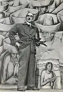 ![]() Alfredo Ramos Martínez in Los Angeles, 1941. In the background, a drawing for the unexecuted mural, Los Charros del Pueblo. | |