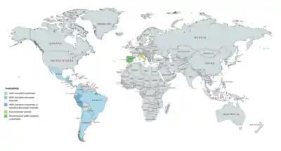 DHPA has been available for use both alone and in combination with estrogens.[8][9][25][62][63][7] It was marketed alone under the brand name Neolutin Depositum in Italy, but this preparation was discontinued.[8][7][57] DHPA has been marketed in combination with estradiol enantate (E2-EN) as a combined injectable contraceptive in at least 19 countries, mostly in Latin America.[5][18][23][16][8][9][62][63] A few different preparations, with varying doses of E2-EN and DHPA and varying availability, have been introduced.[23][5][18][22][25][4][54] These formulations have the following approval and availability († = discontinued in this country):[8][9][62][63][22][23][5][18][4]
