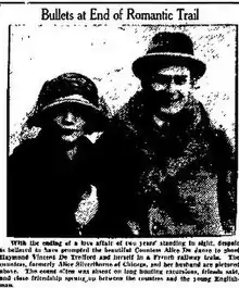- "AMERICAN COUNTESS SHOOTS ENGLISHMAN AND SELF IN PARIS; Former Alice Silverthorne of Chicago and Raymond de Trafford in Grave State. ESTRANGED FROM HUSBAND Shooting Takes Place on Train Just Before Departure for Cross-Channel Steamer". The New York Times. 27 March 1927. Retrieved 29 July 2021.