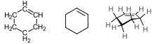 Monocyclic cycloalkenes are cyclopropene, cyclobutene, cyclopentene, cyclohexene, cycloheptene, cyclooctene, and so on. Bicyclic alkenes include norbornene and norbornadiene.