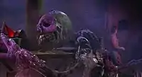 For the scene in which Ash is revealed to be an android, a puppet was created of the character's torso and upper body, which was operated from underneath.[44] During a preview screening of the film, this scene caused an usher to faint.[51][62] In the following scene, Ash's head is placed on a table and reactivated; for portions of this scene, an animatronic head was made using a face cast of the actor, Ian Holm.[49] However, the latex of the head shrank while curing and the result was not entirely convincing.[44] For the bulk of the scene, Holm knelt under the table with his head coming up through a hole. Milk, caviar, pasta, fiber optics, and Foley's Urinary Catheters were combined to form the android's innards.[44][49]