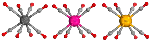 The calculated M-CO and C≡O bond lengths from the equilibrium geometry of each M(CO)8 complex are shown in the table below.[1] Bond length between the alkaline earth center and the CO ligand increases with increasing mass of the central atom. The C≡O bond length decreases with increasing mass of the central atom. Carbonyl stretching frequencies in infrared spectroscopy occur between 1975 cm−1 to 2025 cm−1.[1] The infrared carbonyl stretch of a free CO molecule is 2143 cm−1.[8] Relative to the infrared absorption of the free CO molecule, the infrared peaks of M(CO)8 complexes are red shifted.