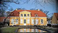 Several of the country houses that were built along the street in the 18th and 19th century are still there today. Møllmanns landsted (No. 6) was built between 1750 and 1753 for Magnus Møllmann, a textile merchant, probably to a design by Philip de Lange. It is in one storey and a Mansard roof and has polygonal projections from the sides and Baroque details on the gables. The design resembles that of Store Mariendals in Hellerup.[2] In 1794, a new building on the street closed the site off, hiding the house from the street.[3] Ludvigs Minde at No. 22 was built by Chief Surveyor Johan Jørgen Berner after he had purchased two of the original farms and merged them into one property. He built two houses on the estate, one for himself and his family and one for summer boarders from Copenhagen.[4][5] Riises Landsted ("Riise's Country House"), is a Neo-Classical country house from 1860. It now houses the Danish Revue Museum.