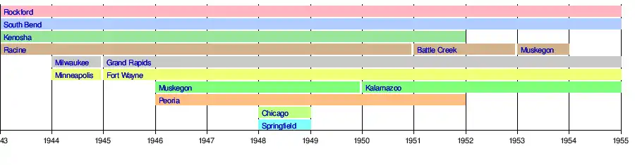 The All-American Girls Professional Baseball League went through three periods of ownership. It was owned by chewing gum mogul Wrigley[11] from 1943 to 1945, wealthy publicist Arthur Meyerhoff from 1945 to 1951, and the teams were individually owned from 1951 to 1954. The teams generally played in Midwestern cities. The South Bend Blue Sox and the Rockford Peaches were the only two teams that stayed in their home cities for the full period of the AAGPBL's existence.[3]